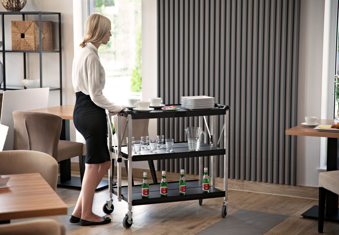 Par conséquent, pensez à assurer aux serveurs de bonnes conditions de travail. Premièrement, ils doivent avoir accès à des équipements qui facilitent l’exécution quotidienne des tâches. La rapidité du service et l’assistance, notamment lors du nettoyage, sont renforcées considérablement par des chariots de service professionnels. D’autres éléments clés du point de vue des serveurs sont, par exemple, les barres porte-bons de commande et toutes sortes de plateaux, ouvre-boîte, tire-bouchons ou portefeuilles professionnels.