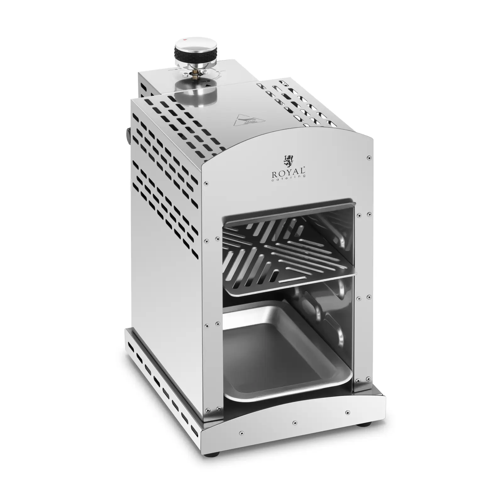 Une grille et une lèchefrite de 25 x 17 cm chacune offrent une capacité suffisante pour plusieurs portions, tandis qu'une poignée amovible garantit la sécurité lors de la manipulation. Après utilisation, tous les composants en acier inoxydable de ce barbecue en acier inoxydable peuvent être nettoyés en un tour de main, ce qui garantit une hygiène constante même en cas d'utilisation prolongée. Le fonctionnement flexible avec du gaz propane ou butane garantit une mobilité totale. Avec ce gril à haute température, les cuisines professionnelles augmentent leur efficacité, productivité et qualité et enthousiasment les clients avec des résultats de grillade constants de première classe à 800 °C en seulement 2 minutes.