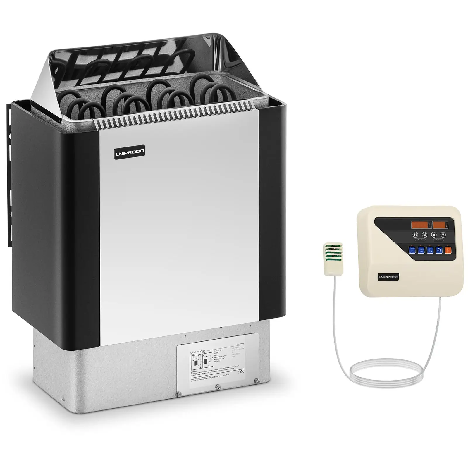 Le poêle électrique sauna UNI_SAUNA_BS6.0KW de la palette d’accessoires pour sauna Uniprodo est idéal pour les bains de chaleur sèche. D’une puissance de 6 kW, il est tout indiqué pour les cabines de 5 à 9 m³. Si nécessaire, cet appareil robuste peut être posé au mur. Une unité de commande UNI_SAUNA_C04 permettant de régler la température, le temps de fonctionnement et l’éclairage du sauna depuis l'extérieur est aussi comprise dans ce kit.