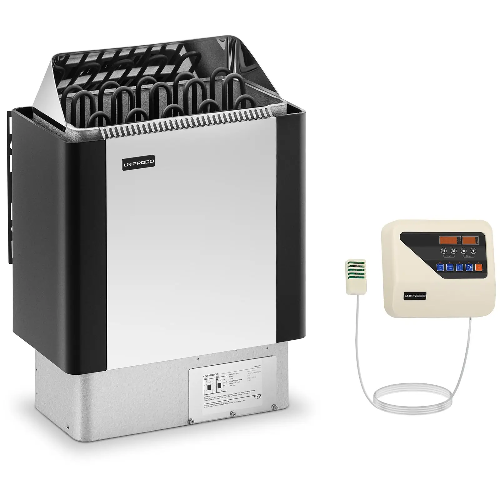 Le poêle électrique sauna UNI_SAUNA_BS9.0KW de la palette d'accessoires pour sauna Uniprodo est idéal pour les bains de chaleur sèche. D'une puissance de 9 kW, il est tout indiqué pour les cabines de 9 à 13 m³. Si nécessaire, cet appareil robuste peut être posé au mur. Une unité de commande UNI_SAUNA_C04 permettant de régler la température, le temps de fonctionnement et l'éclairage du sauna depuis l'extérieur est aussi comprise dans ce kit.
